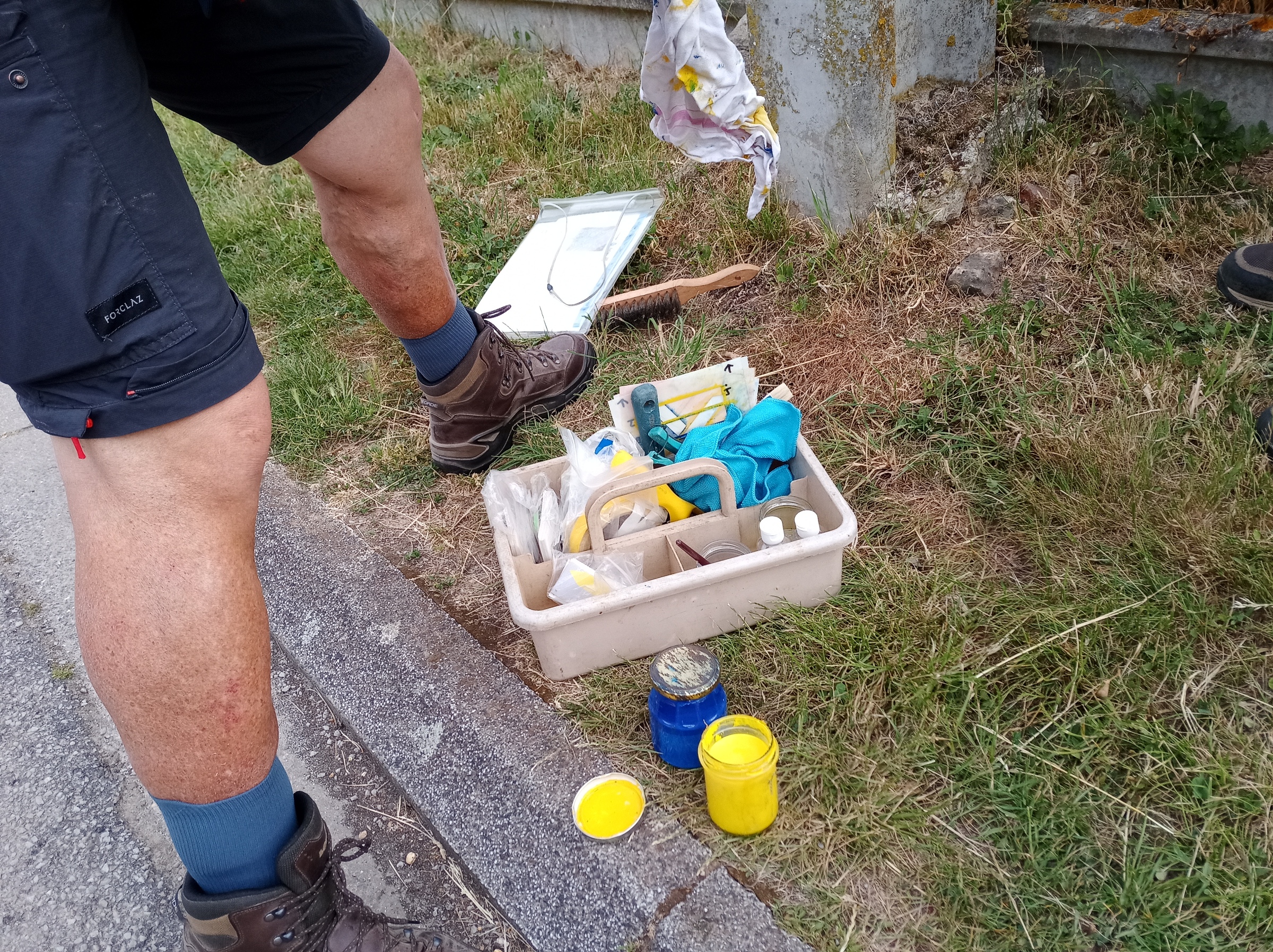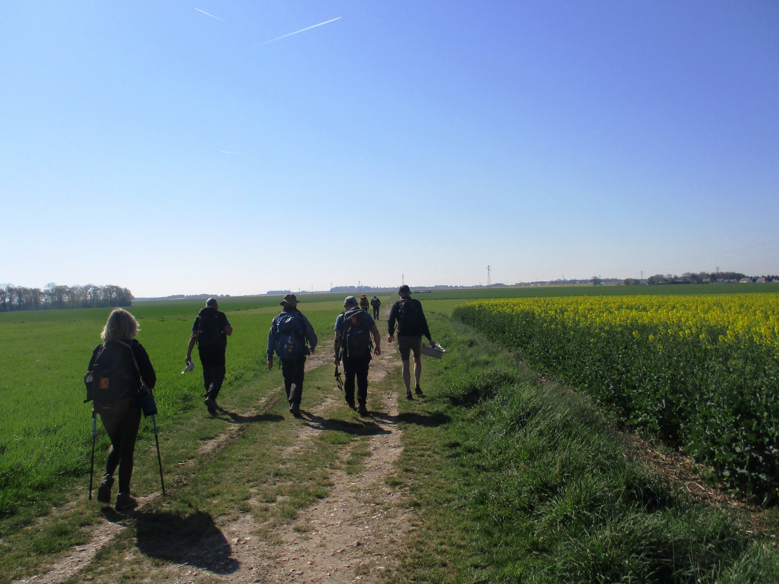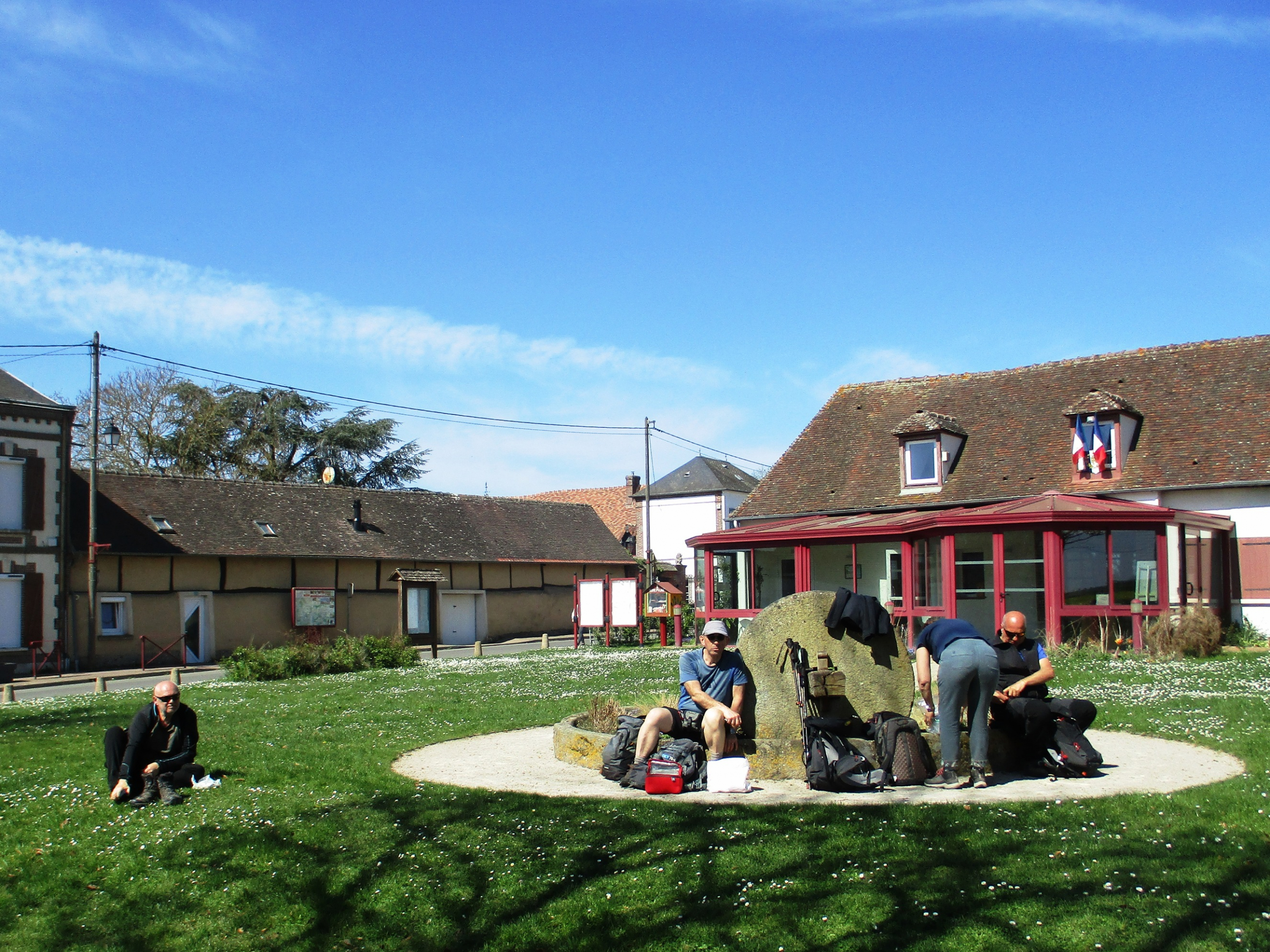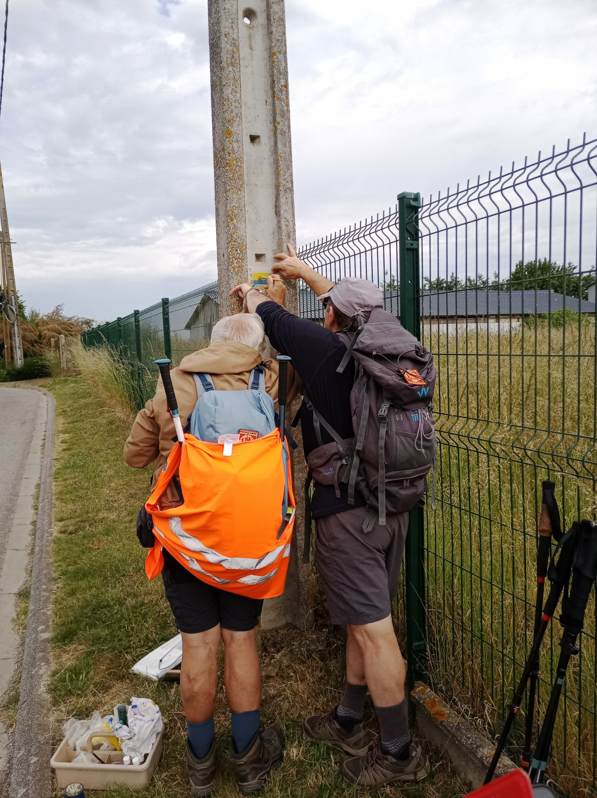Nous nous sommes retrouvés 10 marcheurs sur le parking de Décathlon à Evreux, Richard lui nous attend au château de Melleville. Nous nous mettons en marche pour cette séance de balisage nécessaire pour entretenir ce Chemin des Anglais. Arrivés au point où Richard nous attend nous découvrons un grand chantier de lotissement en cours. Heureusement le Chemin reste marqué. Nous traversons la voie rapide par la passerelle réservée aux piétons, coquille et balises ont bien vieilli est restent bien visible. Ensuite un Chemin tout en ligne droite suivant l’ancienne voie romaine jusqu’à Grossœuvre en passant par Guichainville. Nous rafraichissons quelques balises et en collons d’autres. À Grossœuvre c’est déjà l’heure du casse-croûte et comme le temps est ensoleillé nous pique-niquons.