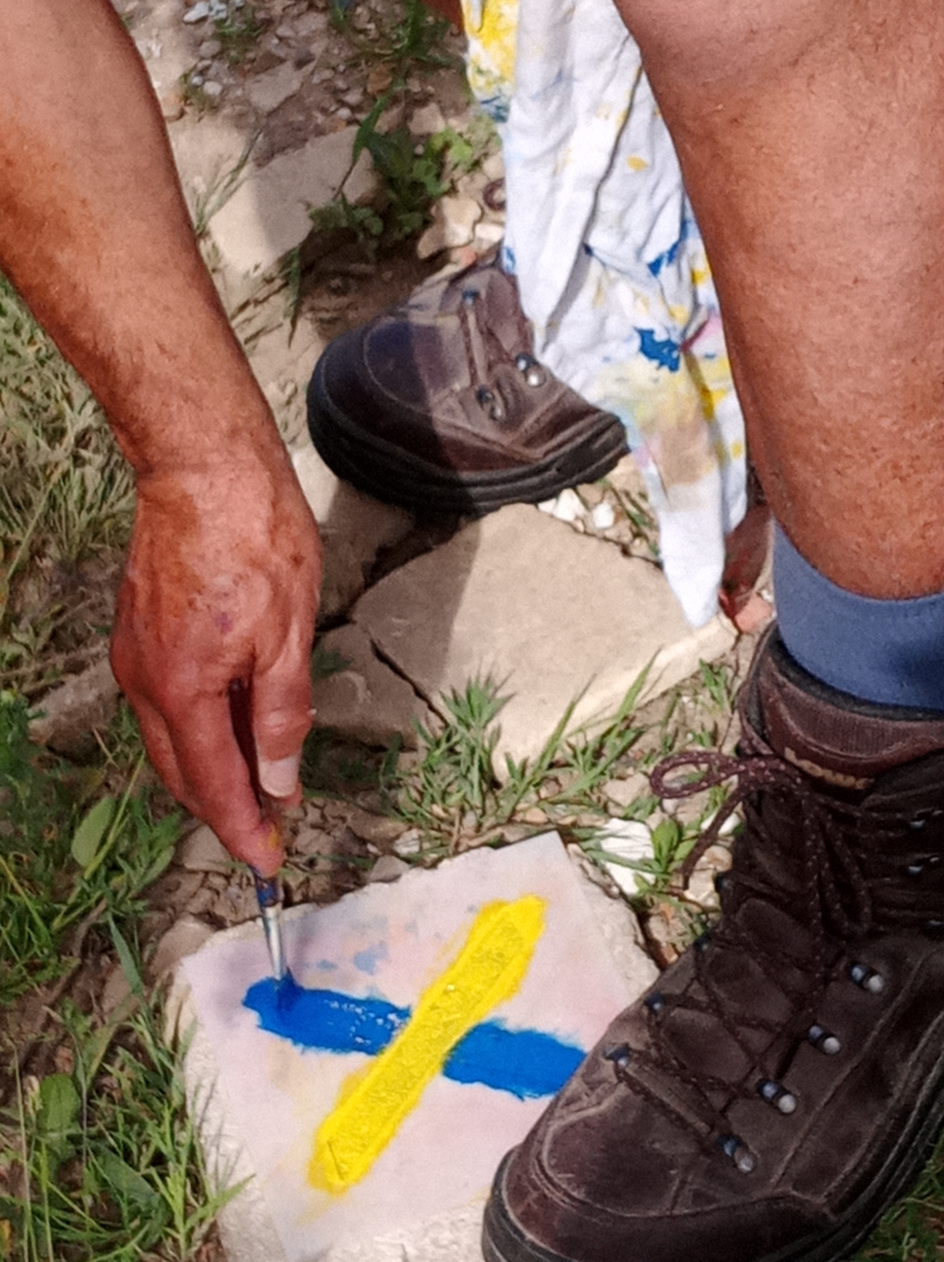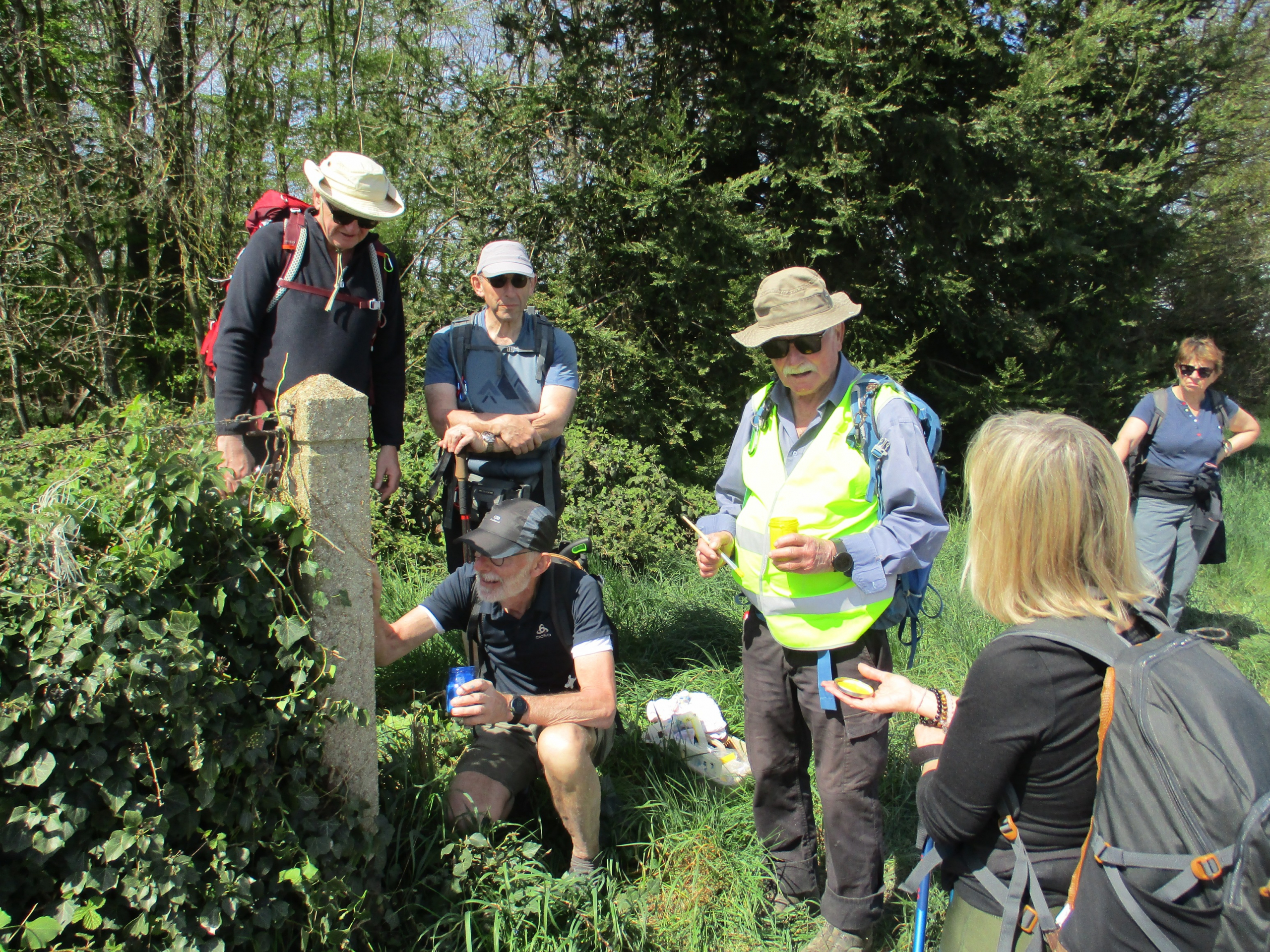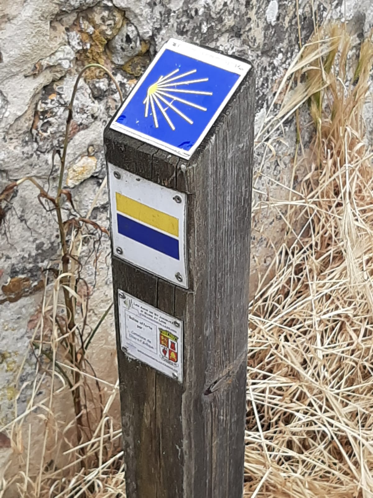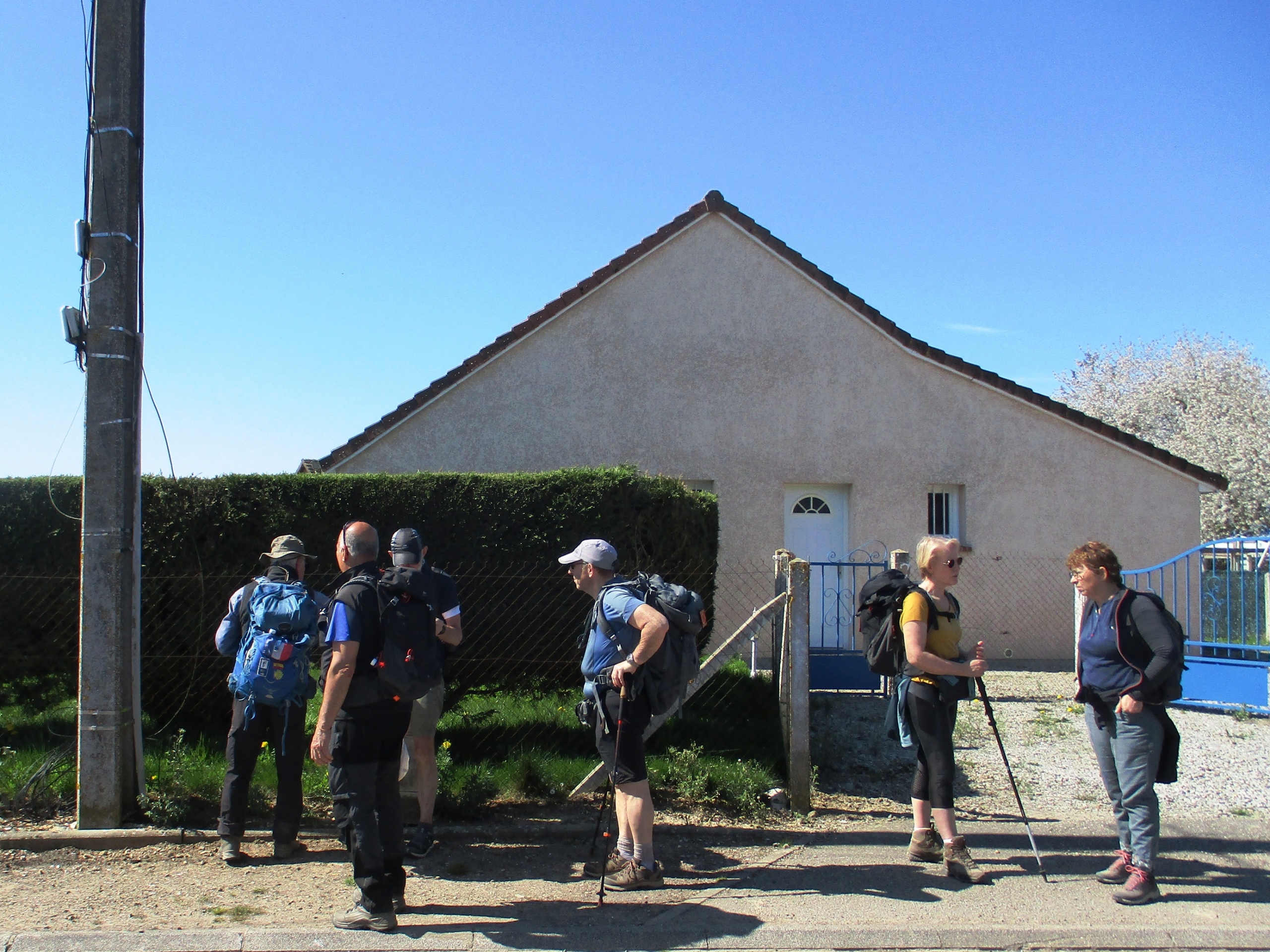 Nous nous sommes retrouvés 10 marcheurs sur le parking de Décathlon à Evreux, Richard lui nous attend au château de Melleville. Nous nous mettons en marche pour cette séance de balisage nécessaire pour entretenir ce Chemin des Anglais. Arrivés au point où Richard nous attend nous découvrons un grand chantier de lotissement en cours. Heureusement le Chemin reste marqué. Nous traversons la voie rapide par la passerelle réservée aux piétons, coquille et balises ont bien vieilli est restent bien visible. Ensuite un Chemin tout en ligne droite suivant l’ancienne voie romaine jusqu’à Grossœuvre en passant par Guichainville. Nous rafraichissons quelques balises et en collons d’autres. À Grossœuvre c’est déjà l’heure du casse-croûte et comme le temps est ensoleillé nous pique-niquons.