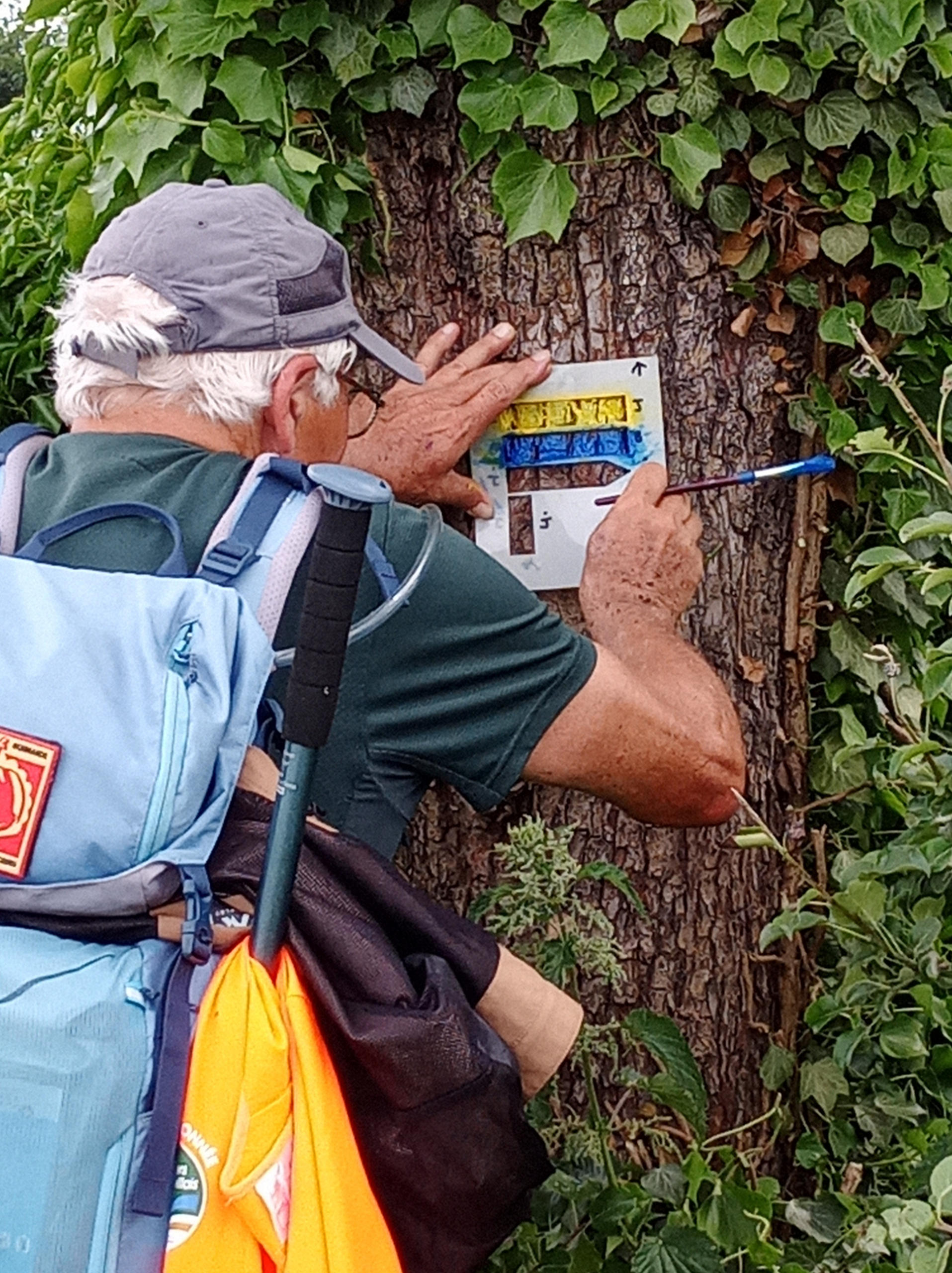 Nous étions 5 à Coudres pour cette seconde séance de balisage et de débroussaillage sur le Chemin des Anglais. Un peu plus de travail sur cette deuxième marche car il a fallu ajouter et modifier quelques balises pas évidentes. Nous faisons pique-nique à Illiers-l’Évêque devant l’église. Ensuite nous reprenons notre marche avec surtout vérification et débroussaillage car les balises revues en juin 2023 ont bien vieilli. Le chemin, un peu avant d’arriver au « Fayel », est utilisé comme terrain de cross par des motos et des quads, et c’est habituel dixit les propriétaires d’une maison proche que nous avons rencontrés. Il faudra y revenir pour bien baliser ce secteur. Nous finissons ce parcours de 16 km par Mesnil sur l’Estrée où nous récupérons la voiture pour revenir à Coudres pour le goûter. Christian